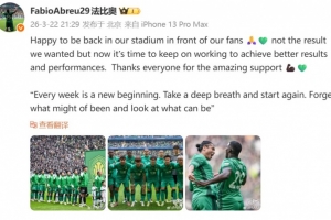 体育资讯3月22日讯 国安外援法比奥更新社媒,谈到了本轮主场1-1战平申花的感受。