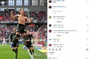 卡尔也在赛后通过社媒晒出自己进球后的脱衣庆祝照,并配文:“重大的胜利??42”。